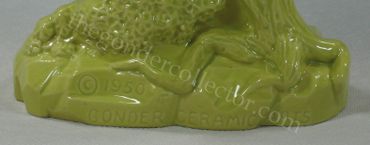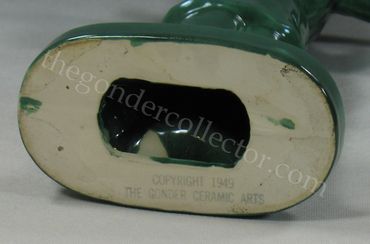 The circa 1949 version of the Asian Water Bearer figures (#777) are marked with an ink stamp mark. COPYWRITE GONDER CERAMIC ARTS is stamped on the bottom of the figure. Because the bottoms are unglazed, these could be marked in such a manner. The ink stamp is prone to fading and may be difficult to see. With the exception of the La Gonda line, the editor knows of no other Gonder pieces marked by ink stamp.