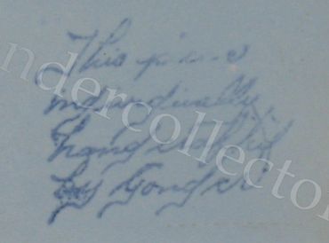 The La Gonda line of Luncheon ware also secured a unique mark. These pieces are ink stamped with the phrase "This piece individually handcrafted by Gonder". The ink stamp is blue and also prone to fading. The mark on smaller pieces from the line is often difficult to decipher due to extremely small font size. The quality of the mark is often poor and/or illegible.